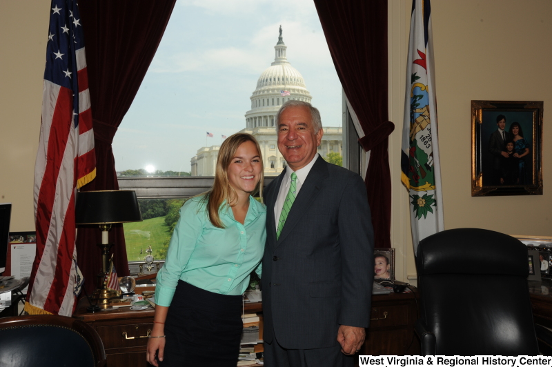 - Congressman Rahall stands in his Washington office with a woman wearing a teal shirt.