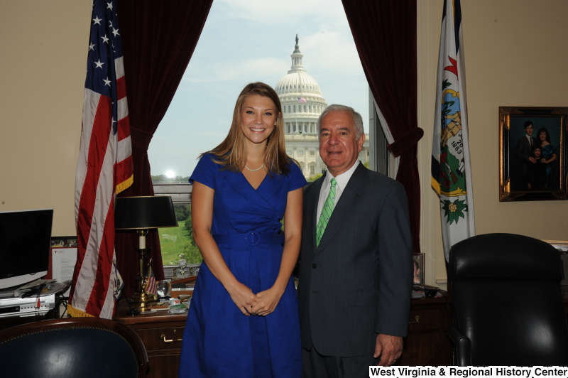 - Congressman Rahall stands in his Washington office with a woman wearing a blue dress.