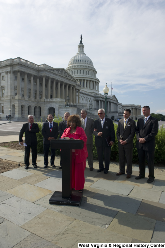 - A woman stands at a podium with Congressman Rahall and other people during an outdoor press conference near the Capitol Building.