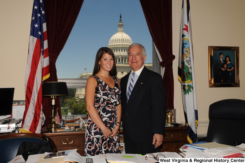 - Photograph of Congressman Rahall standing in his Washington office with a young woman wearing a ribbon-patterned dress