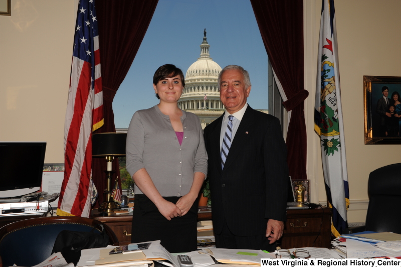 - Congressman Rahall stands in his Washington office with a woman wearing a grey cardigan.