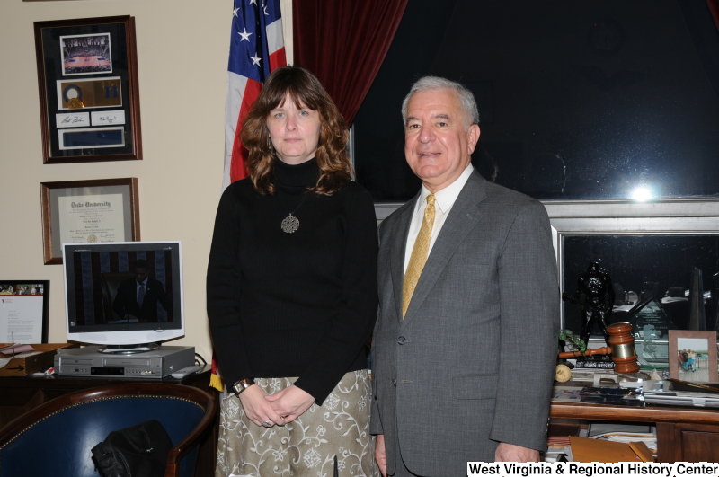 - Photograph of Congressman Rahall standing in his Washington office with a woman wearing a black sweater, print skirt, and necklace