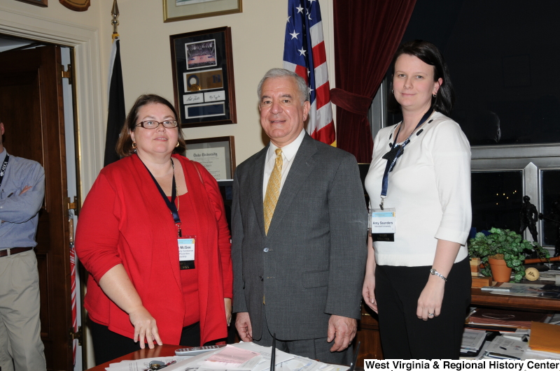 - Photograph of Congressman Rahall standing in his Washington office with two women wearing name badges, including Amy Saunders, Marshall University