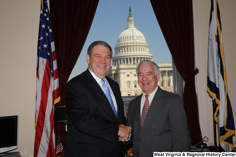 - Congressman Rahall stands in his Washington office with a man wearing a dark pinstripe suit and light blue tie.