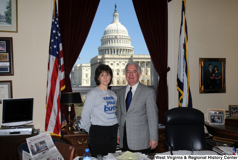 - Congressman Rahall stands in his Washington office with a woman wearing a sweatshirt.