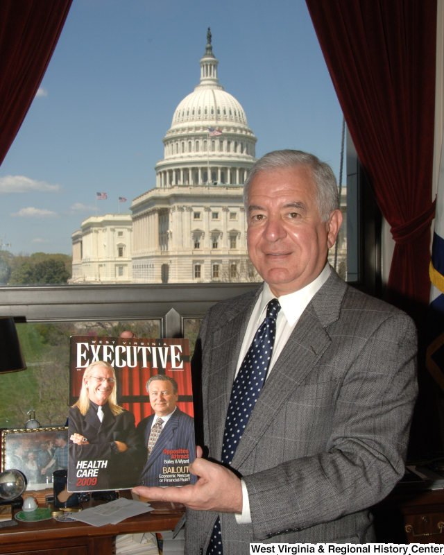 - Congressman Rahall in his Washington office holds a copy of West Virginia Executive magazine.