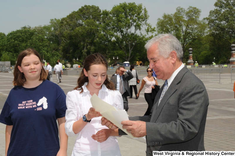 - Congressman Rahall looks at papers with two girls.