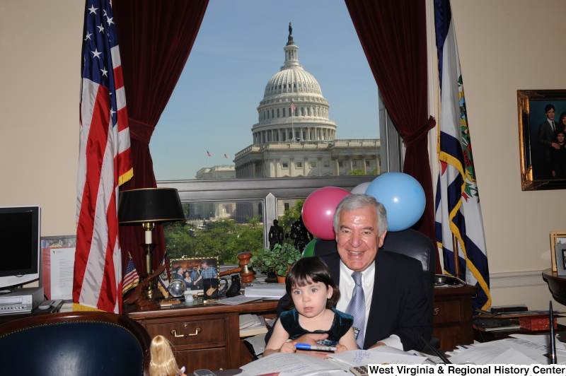 - Congressman Rahall sits in his Washington office with a girl and balloons.