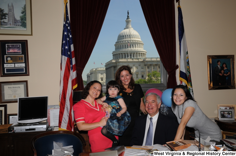 - Congressman Rahall sits in his Washington office with three women and a girl, with balloons.