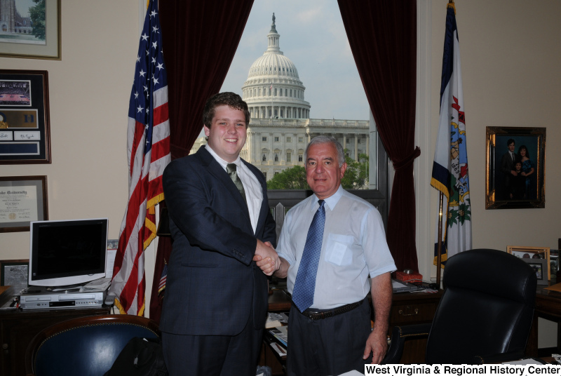 - Photograph of Congressman Rahall in his Washington office shaking hands with a man wearing a dark blue suit