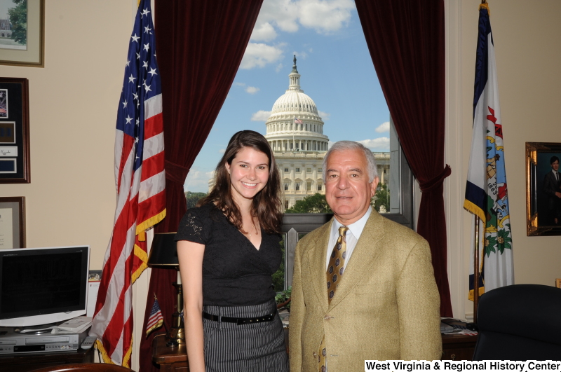 - Congressman Rahall stands in his Washington office with a woman wearing a black shirt and black and white striped skirt.