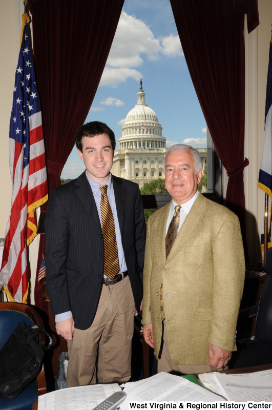 Photograph of Congressman Rahall standing in his Washington office with a man wearing a dark pinstripe sport coat and gold and black striped tie