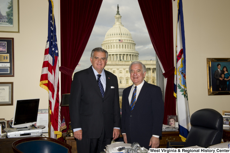 - Photograph of Congressman Rahall standing in his Washington office with a man wearing a dark pinstripe suit and blue and white spotted tie