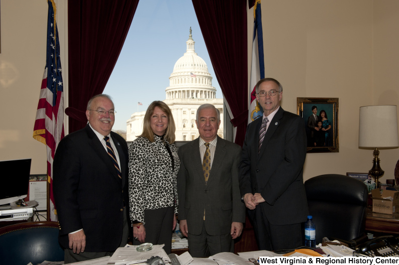 Photograph of Congressman Rahall standing in his Washington office with two men and a woman, who wears a leopard-print jacket