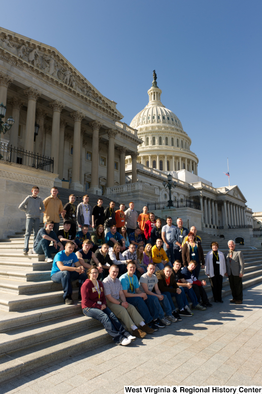 - Congressman Rahall stands on the steps of the Capitol Building with teenagers and adults.