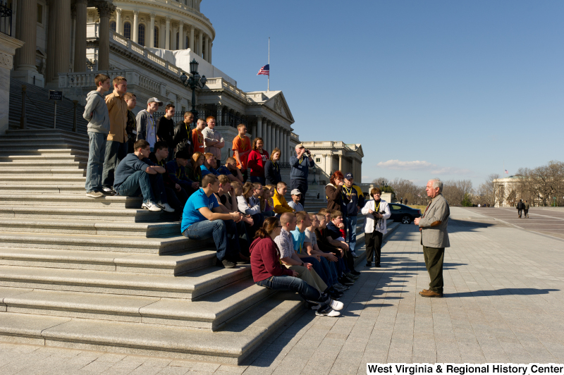 Photograph of Congressman Rahall speaking to adults and teenagers on the steps of the Capitol Building