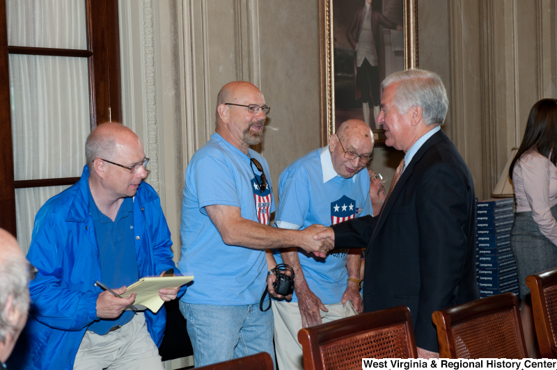 - Congressman Rahall shakes hands with men wearing red, white, and blue "Honor Flight" shirts at a military award ceremony.