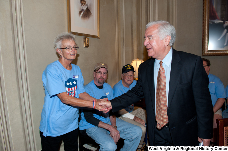 - Congressman Rahall shakes hands with a woman at a military award ceremony.
