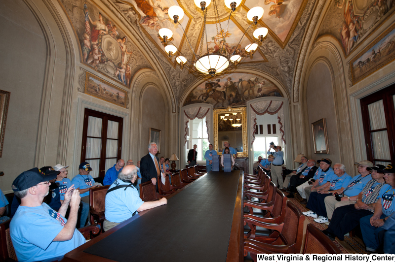 Photograph of Congressman Rahall speaking to a group of veterans at a military award ceremony