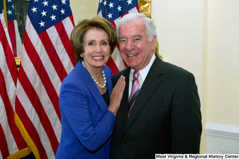 - Congressman Rahall and Nancy Pelosi stand in front of United States flags.