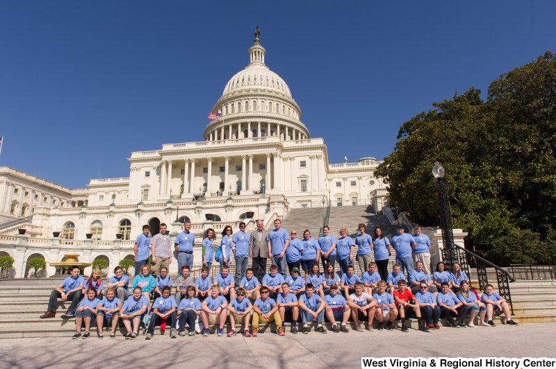 - Photograph of Congressman Rahall on the steps of the Capitol Building with children and adults wearing blue shirts labeled "MMS 8th Grade D.C. Trip"