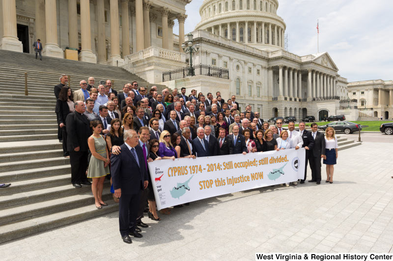 - Congressman Rahall stands on the steps of the Capitol Building with a large group of people behind a banner labeled "CYPRUS 1974-2014: Still occupied; still divided. STOP this injustice NOW".