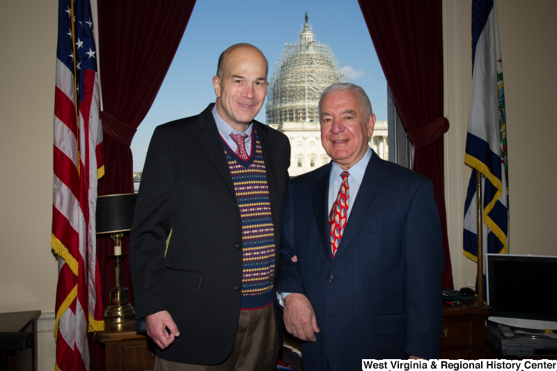 - Congressman Rahall stands in his Washington office with a man wearing a dark blazer and multicolored sweater.