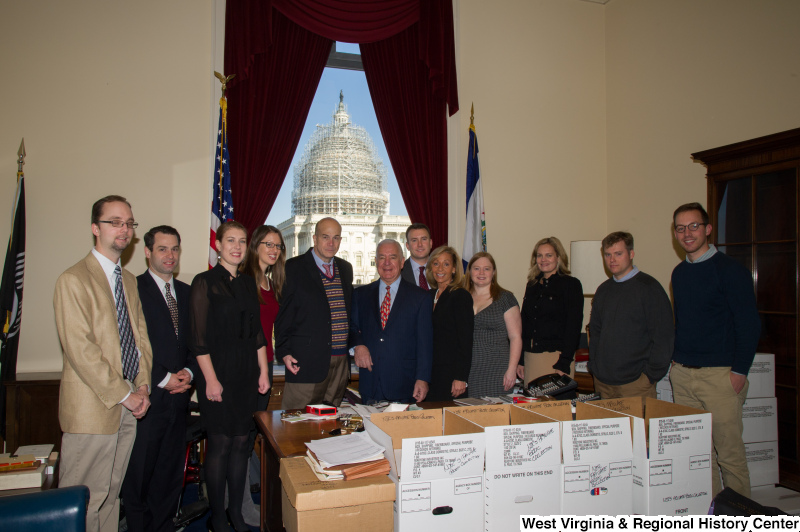 - Congressman Rahall stands in his Washington office with a group of people behind archival storage boxes.
