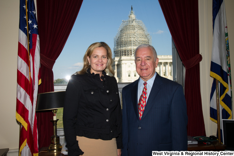 Photograph of Congressman Rahall standing in his Washington office with a woman wearing a dark top and khaki skirt