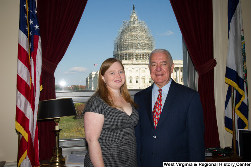 - Congressman Rahall stands in his Washington office with a woman wearing a grey and black dress.
