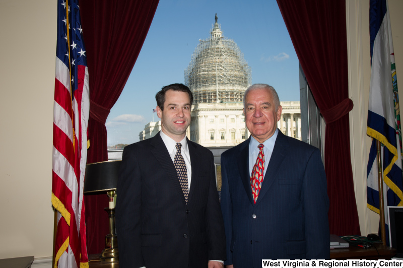- Congressman Rahall stands in his Washington office with a man wearing a dark suit and oval-patterned tie.