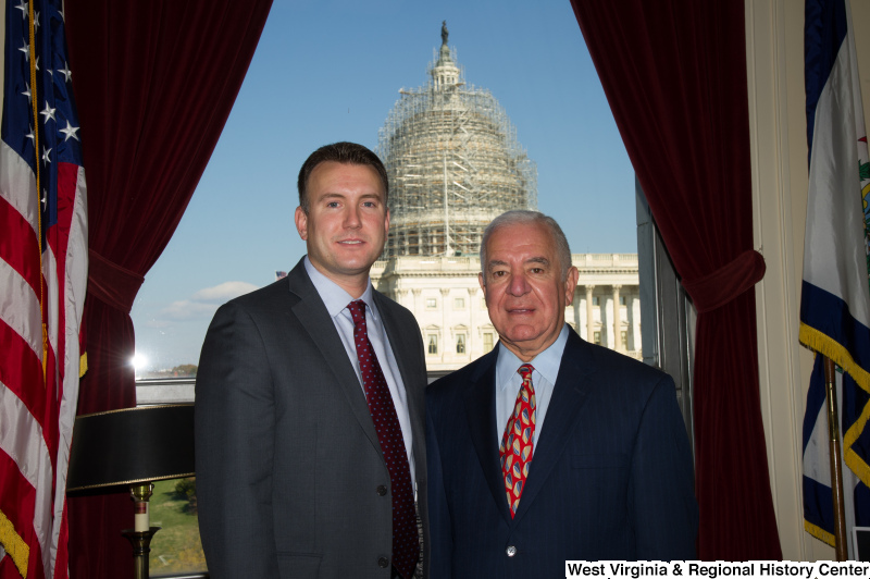 - Congressman Rahall stands in his Washington office with a man wearing a grey suit and burgundy spotted tie.