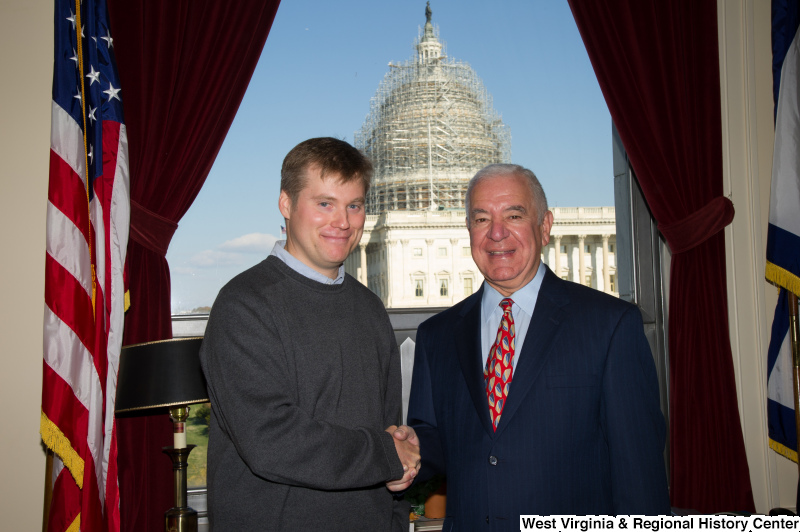 - Congressman Rahall stands in his Washington office with a man wearing a grey sweater.