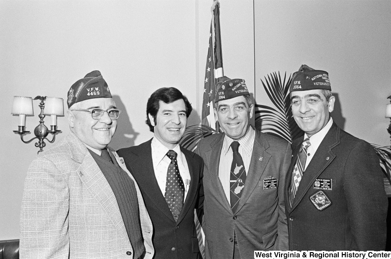 - Congressman Rahall poses with Raymond H. Honaker, Ralph W. Honaker, and another man who wear Veterans of Foreign Wars caps and insignias.