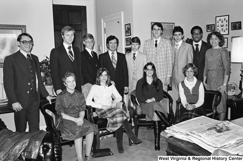 - Congressman Rahall poses for a photograph with twelve men and women in an office.