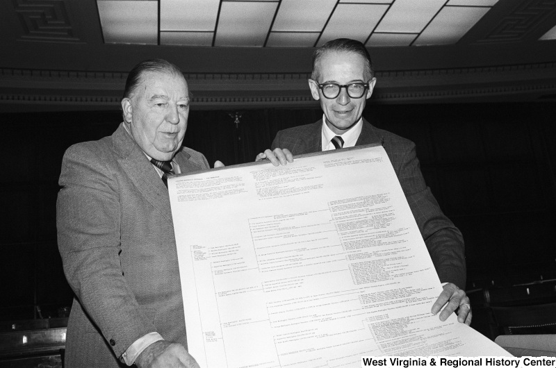 Photograph of Jennings Randolph and another man holding a large print of a Washington family tree