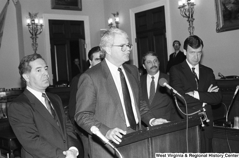 - Photograph of Congressmen George Miller, Nick Rahall, Sam Gejdenson, and Peter Kostmayer speaking at an event