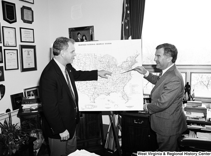 - Photograph of Congressman Nick Rahall and an unidentified person discussing the proposed national highway system