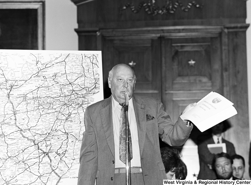 Photograph of an unidentified representative speaking on the Virginia opposition to Corridor 6A, Route 460