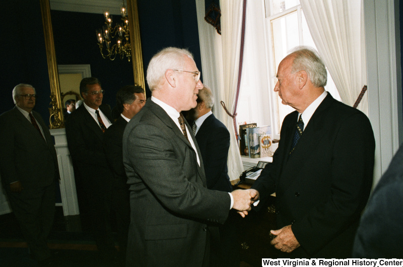 Photograph of Congressman Victor Fazio (CA) shaking hands with an unidentified foreign dignitary