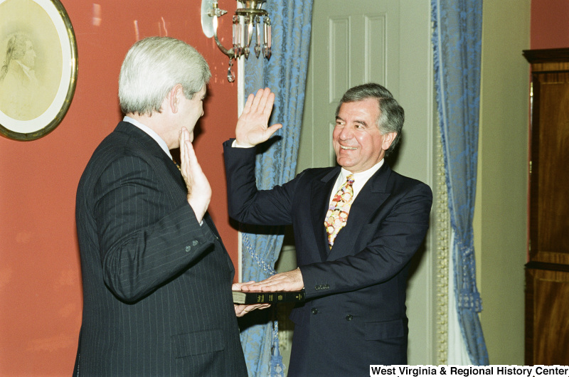 Photograph of Congressman Nick Rahall and Newt Gingrich at a swearing-in ceremony