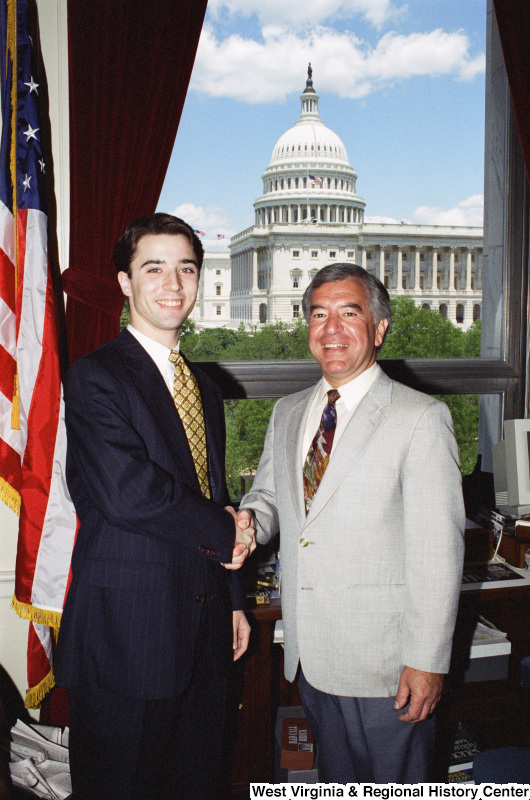 - Photograph of an unidentified man posing with Congressman Nick Rahall in his office