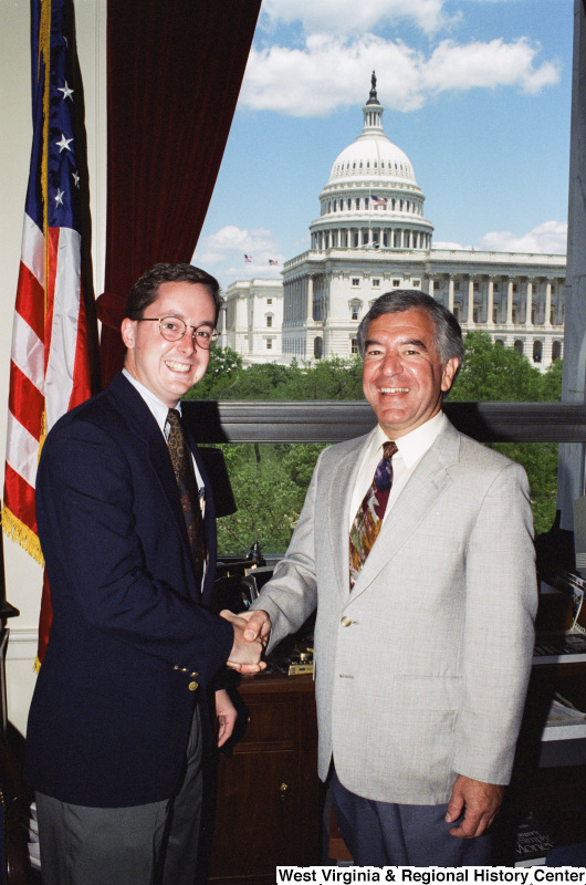 - Photograph of Congressman Nick J. Rahall posing with an unidentified man in his office