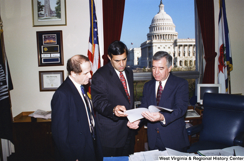 - Photograph of Congressman Nick Rahall and two unidentified men looking over documents