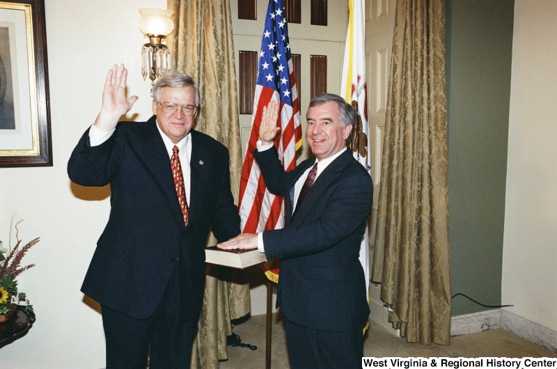 - Photograph of Congressmen Nick Rahall and Dennis Hastert at a swearing-in ceremony