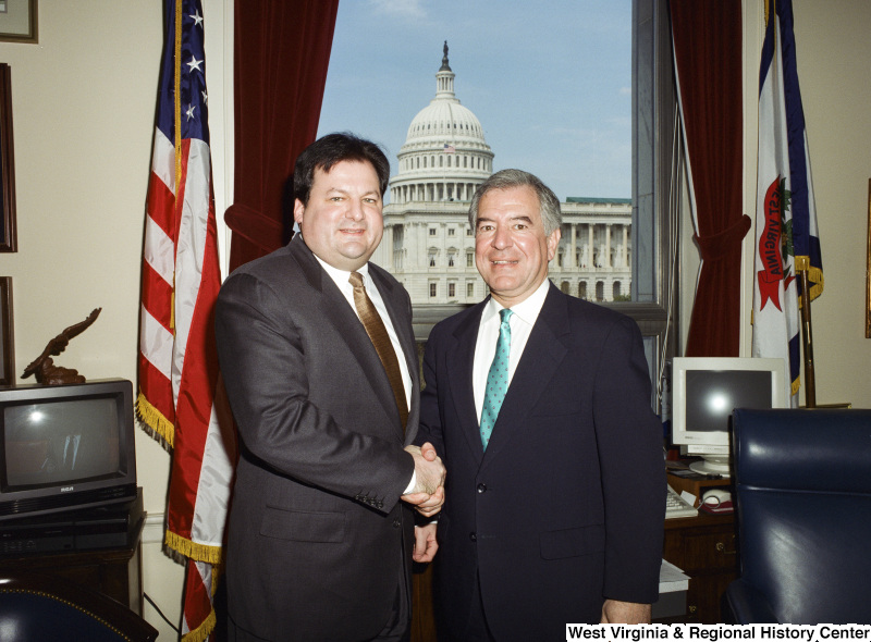 Photograph of Congressman Nick J. Rahall in his Washington office with an unidentified man