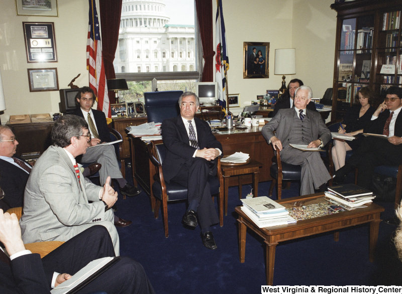 Photograph of Congressman Nick J. Rahall, Senator Robert C. Byrd, and others in a meeting