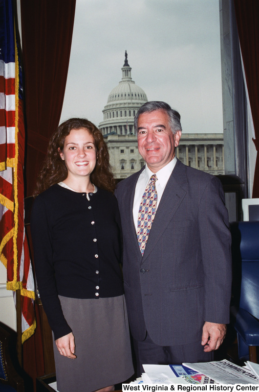 Photograph of Congressman Nick Rahall and an unidentified young lady in his Washington office