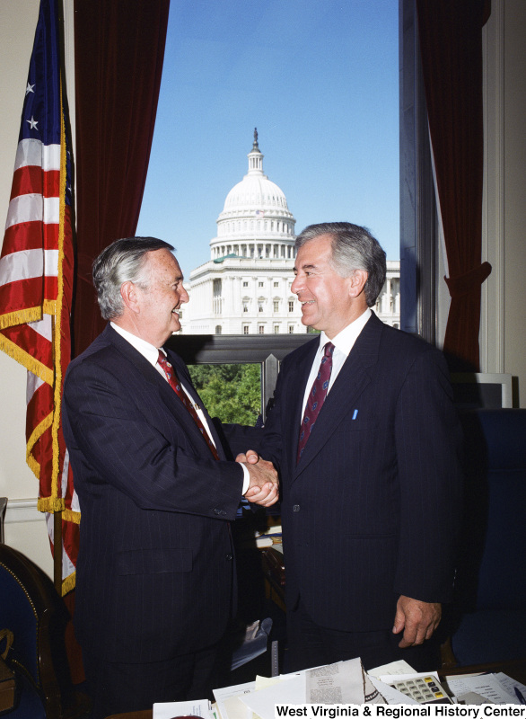 - Photograph of Congressman Nick Rahall shaking hands with an unidentified man in his Washington, D.C. office