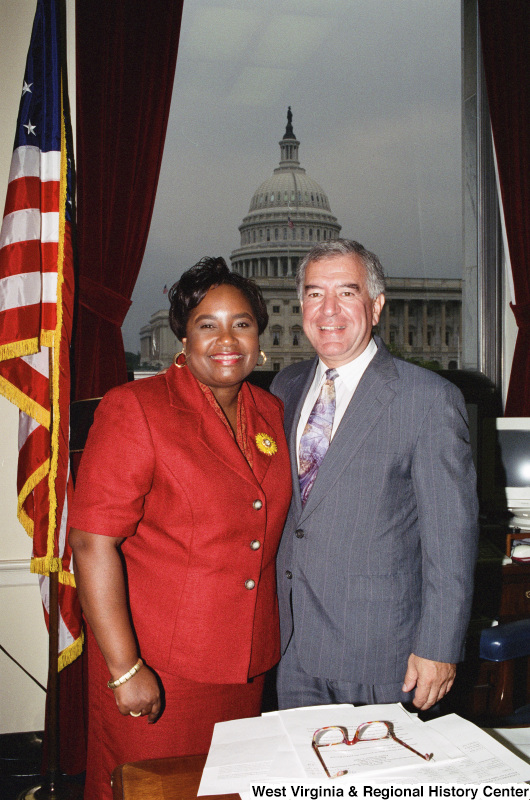 Photograph of an unidentified woman posing with Congressman Nick Rahall in his Washington office